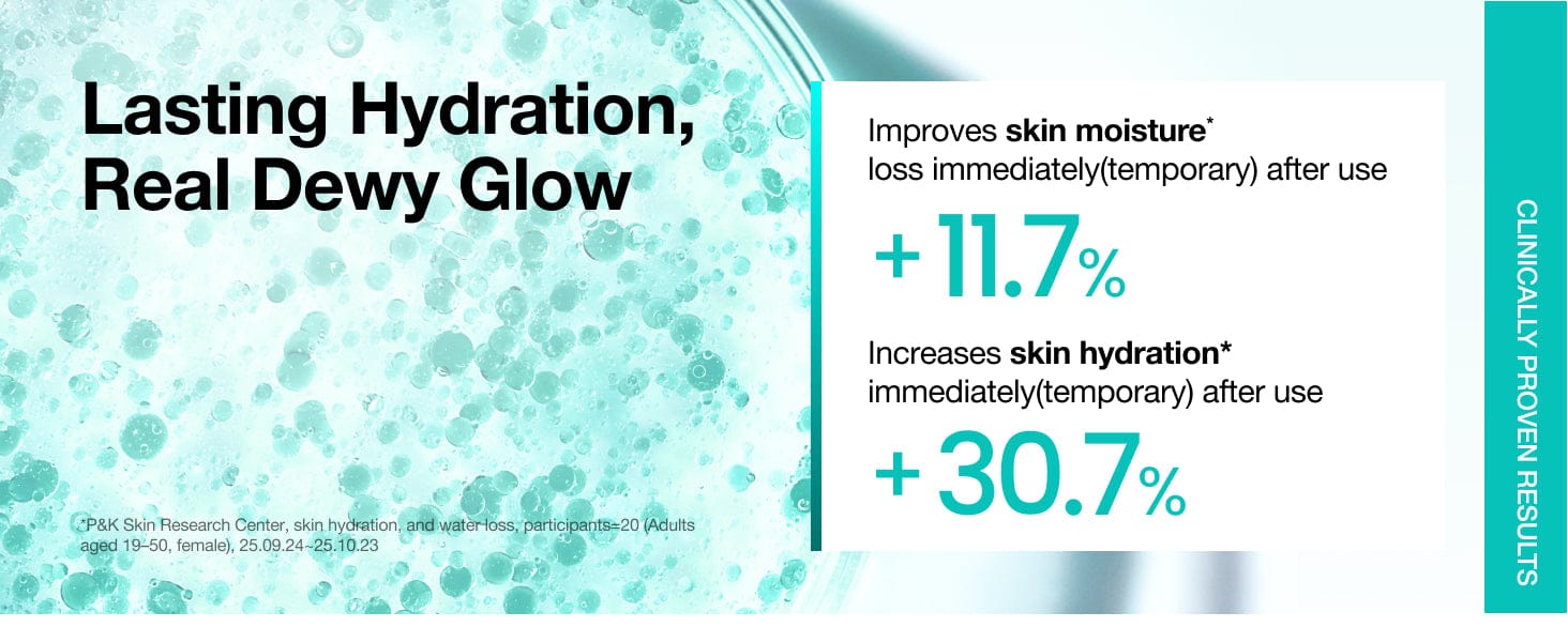 Calms heat and smooths texture for better makeup application. Use before or after makeup for long-lasting hydration* and glow—no caking or smudging. *P&K Skin Research Center, 24-hour inner skin hydration persistence, participants=20 (Adults aged 20–59, female), 25.09.23~25.10.23