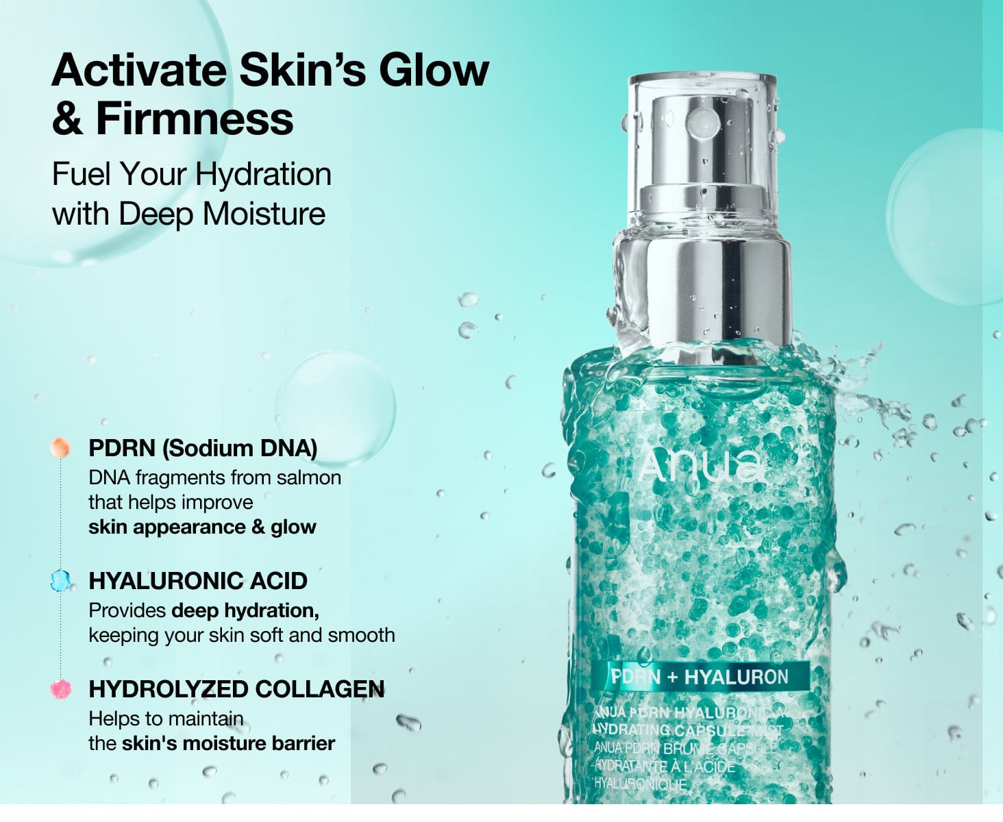 A Hydra-Glow Capsule Mist infused with PDRN (Salmon DNA) and Hyaluronic Acid. With 2,000ppm of PDRN, it helps boost radiance and firmness, delivering early youthful-looking care. It helps replenishes hydration for healthy, and plumper skin.