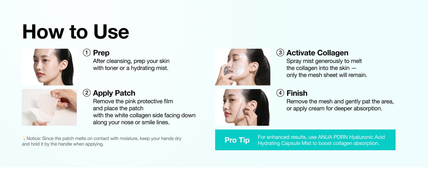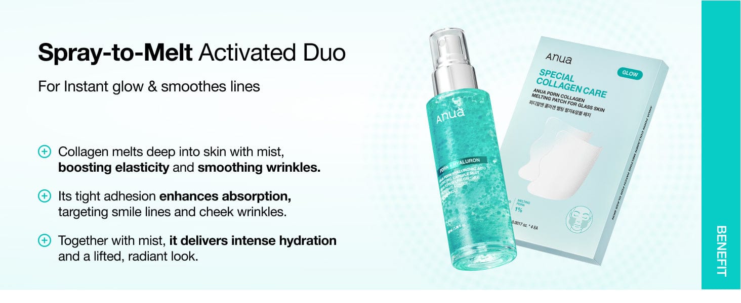 - Clinical results show a 19%* improvement in neck firmness after 4 weeks of combined use. Simply spray the mist after applying the patch to melt the collagen layer instantly and enhance absorption. *P&K Skin Research Center, lifting of nasolabial fold area when concurrently used with ANUA PDRN HYALURONIC ACID HYDRATING CAPSULE MIST, participants=20 (Adults aged 19–50, female), 25.09.24~25.10.23